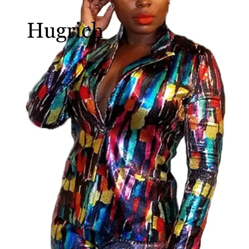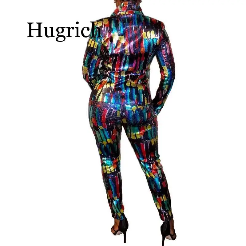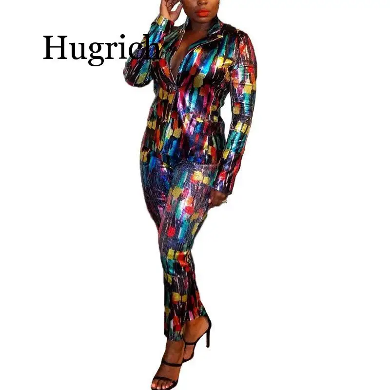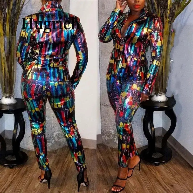 | 2020 Women Tracksuit Full Sleeve Sequined Print Blazers Pants Suit Office Lady Casual Elastic Waist Pants Two Piece Set |