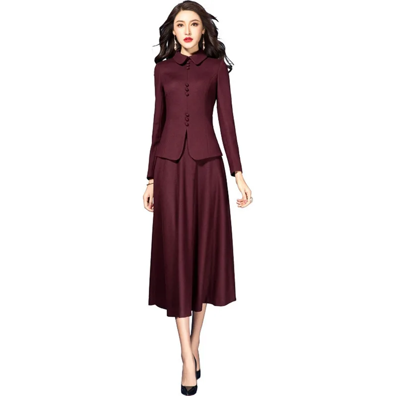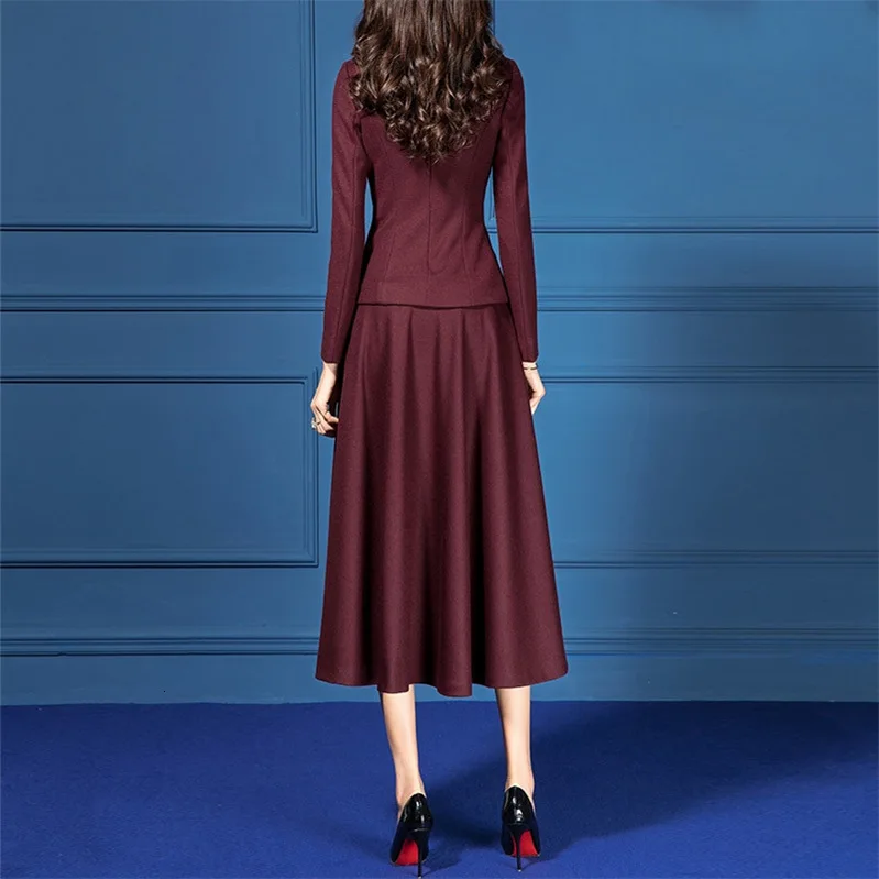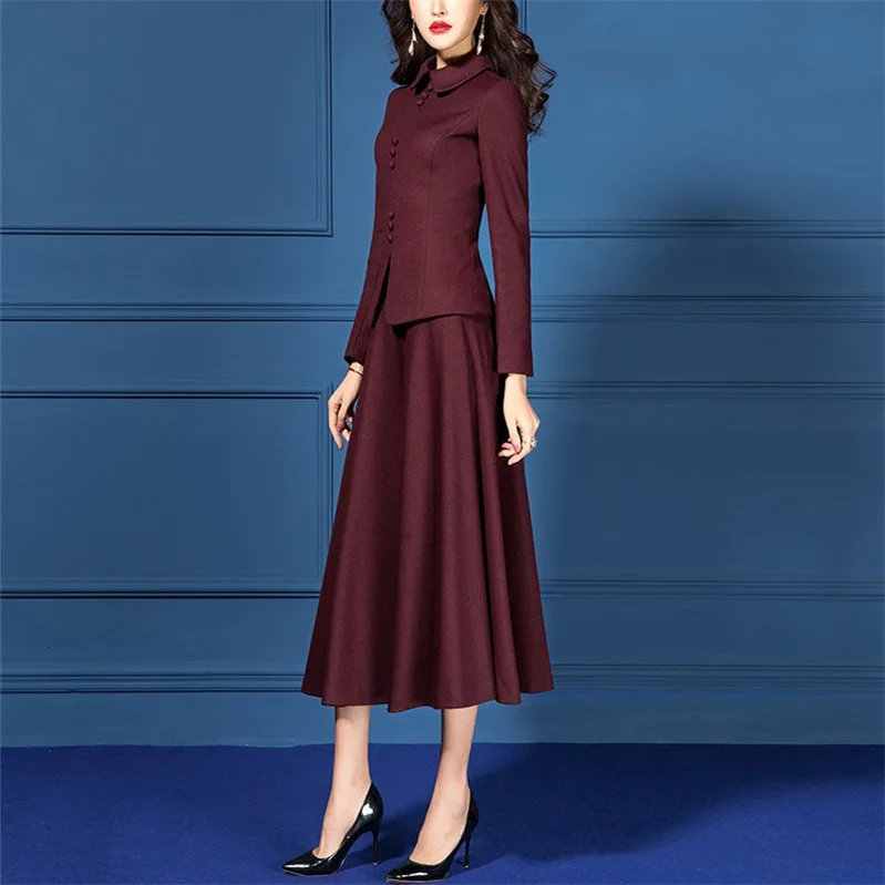 | Vintage Autumn Winter Womens Dress Suits Set Wool Slim Blazer Jacket Woolen 2 Two Piece Office Lady Clothes Burgundy Outfits |