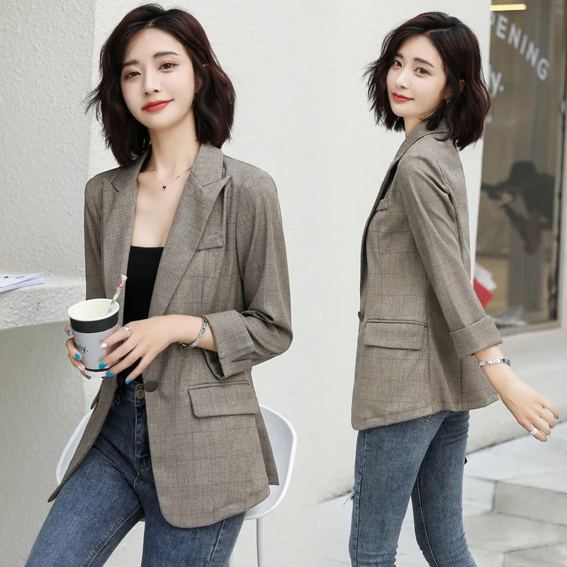 2020 new Spring Korean womens slim and fashionable casual suit Plaid Blazer women set female jacket Style Coat Plaid Printed