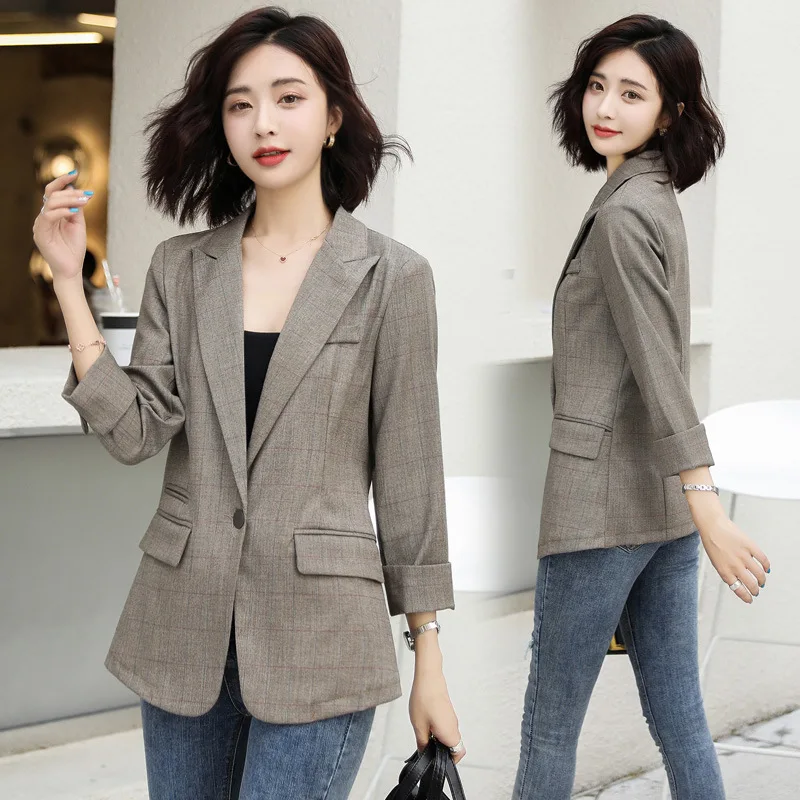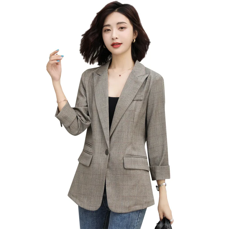 Female Elegant Formal Casual Women Blue Pink Apricot Plaid Blazer Long Sleeve Slim Blazer New Dress Outwear Jackets and Coats