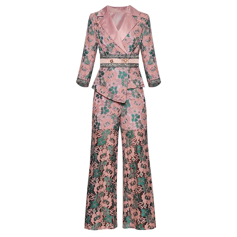 | 2020 New Arrival Pants Suit Women 2 Two Piece Set Three Quarter Sleeve Floral Lace Blazer Wide Leg Pants Runway Fashion Pantsuit |