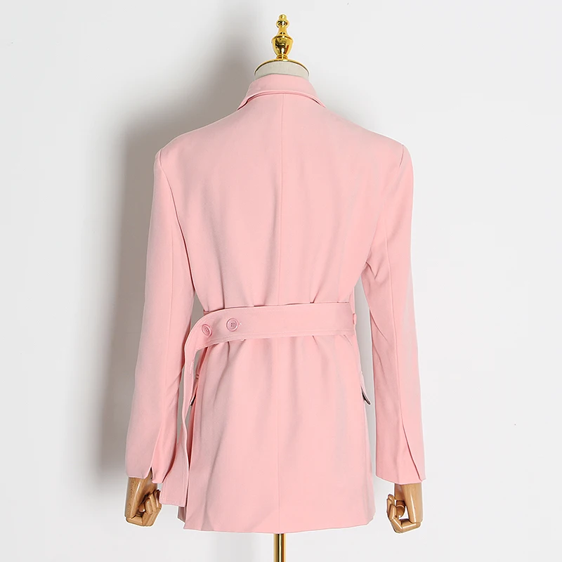 Elegant Pink Womens Blazer Notched Long Sleeve Pocket High Waist Sashes Suit Female 2020 Spring Fashion New
